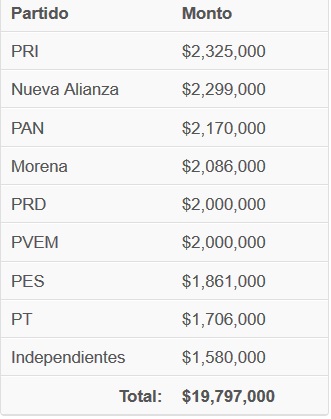 Los institutos de los diferentes partidos políticos, recibieron un bono adicional de 18 millones de pesos por inscribir a sus representantes de casilla para las elecciones de este domingo. La función de los representantes de partido es vigilar el voto en las 3,644 casillas instaladas en el Estado de Hidalgo, en las que se renovará a Gobernador, diputados locales y presidentes municipales de los 84 municipios.