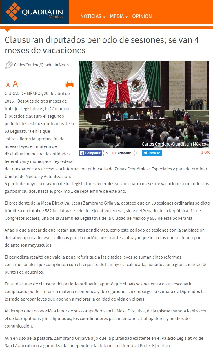 Abril 29 del 2016.- Pareciera tratarse de una broma al leer el artículo de la agencia de noticias Quadratin, 4 meses de vacaciones es el premio por legislar durante 3 meses, si la nota es cierta, regresarán a sus labores el primero de Septiembre, ¿Quién desea unas vacaciones así?
