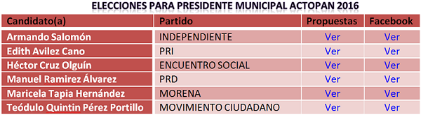 El próximo 5 de Junio en algunos estados, incluyendo Hidalgo, se llevarán a cabo elecciones, en nuestro caso, se elegirán presidente municipal, diputados locales y gobernador, Dedicamos este espacio para conocer un poco más a los candidatos que en esta ocasión, contienden por la Alcaldía de Actopan, los cuales en orden alfabético, son: