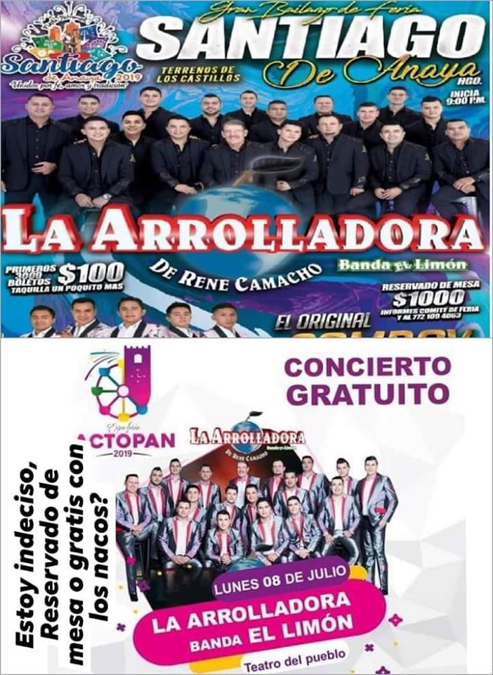 Si estás indeciso o indecisa de ir al concierto de la Arrolladora Banda el Limón en Actopan «con los nacos» o en Santiago de Anaya reservando tu mesa por $1,000 pesitos, no te preocupes, puedes ir a ambos.