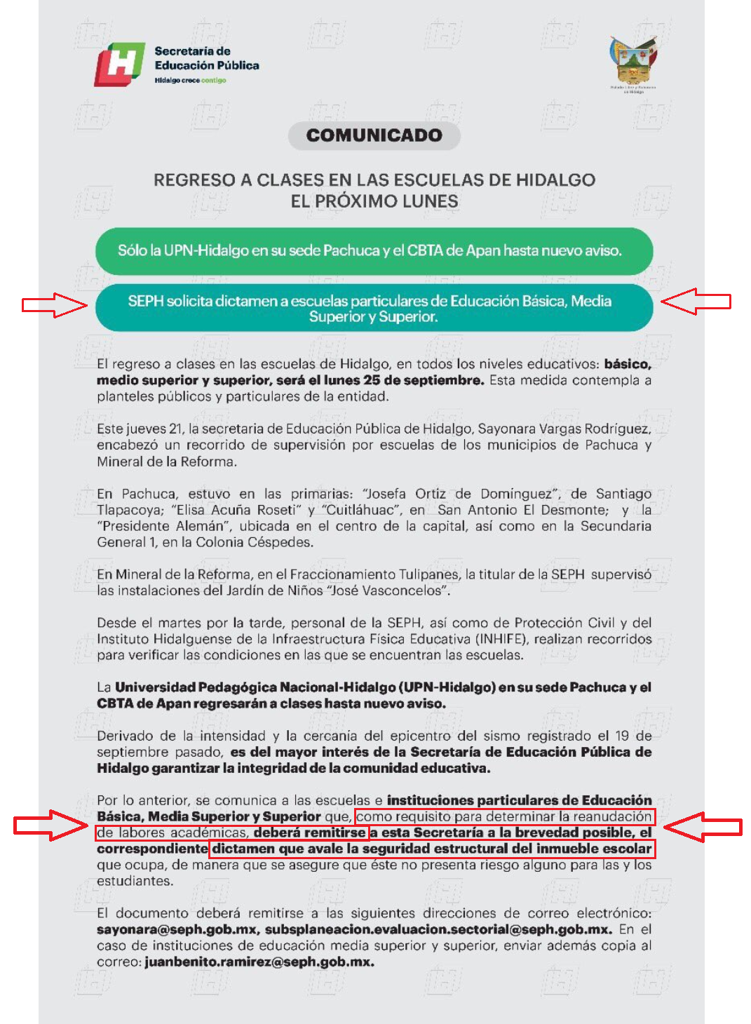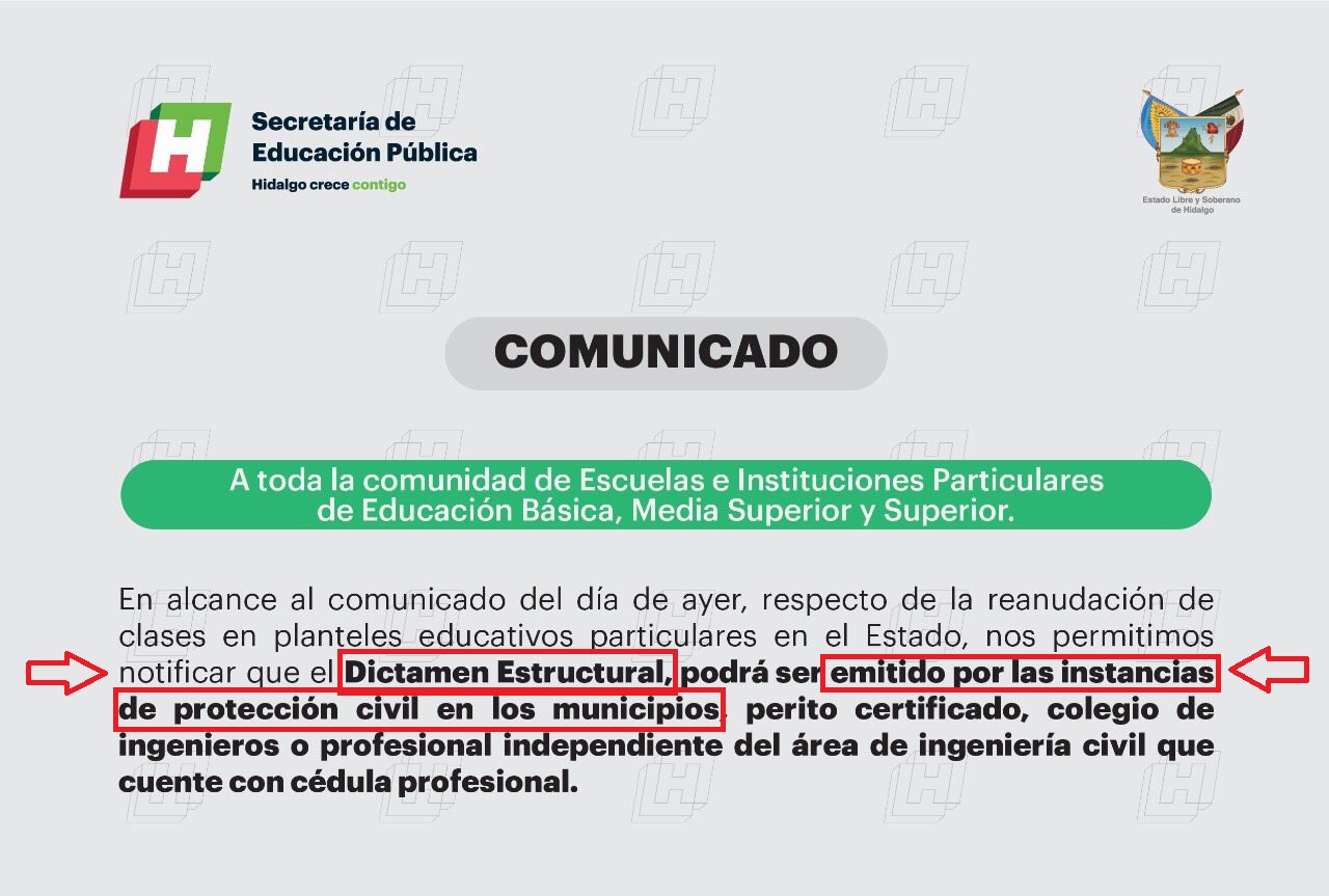 La Secretaría de Educación Pública del Estado de Hidalgo, (SEPH) a través de su cuenta de twitter, el pasado 22 de Septiembre emitió un comunicado, donde se hace necesario un dictamen que avale la seguridad estructural del inmueble escolar.