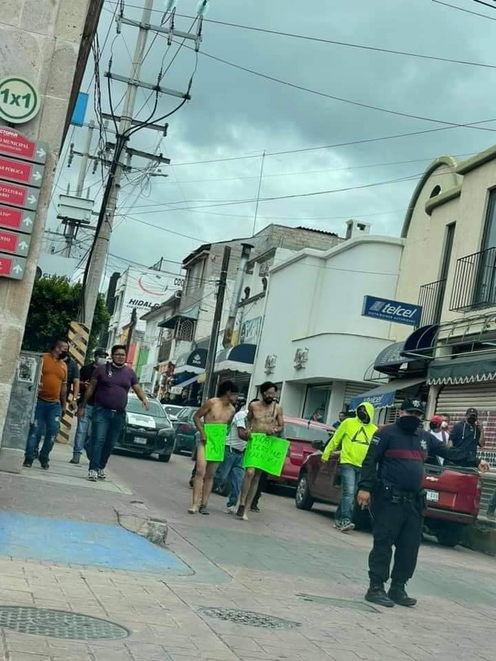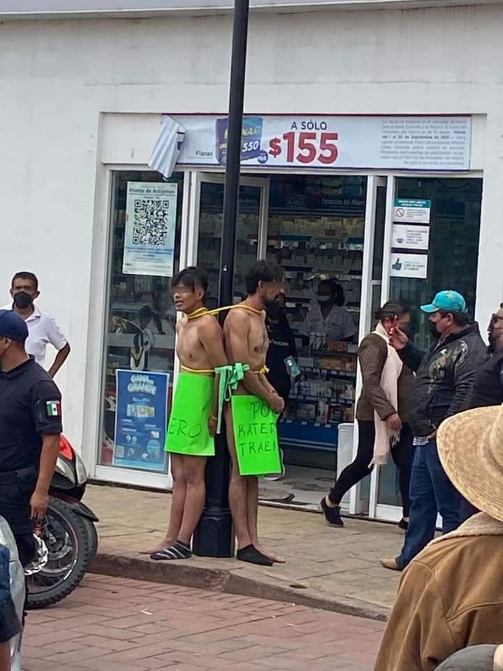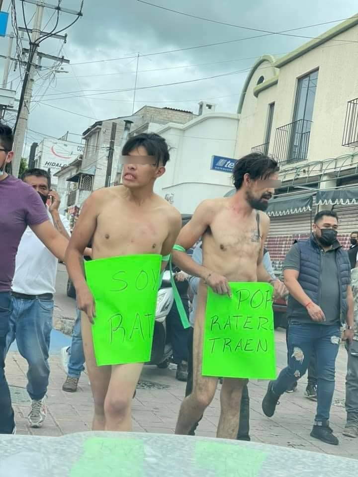 Comerciantes y vecinos del centro de Actopan, retienen y exhiben semidesnudos a dos hombres, a quienes señalan de cometer robos en la zona, los presuntos delincuentes fueron amarrados a un poste con una cartulina con la leyenda “Soy Rata” “Por ratero me traen”.