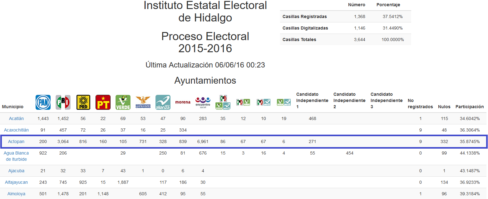 Hasta este momento, aún cuando no se han terminado de digitalizar todas las actas de casilla en el PREP, el candidato del Partido Encuentro Social (PES), Héctor Cruz Olguín lleva una gran ventaja sobre su principal competidora del Partido Revolucionario Institucional, Edith Avilés Cano, y con base en los resultados del PREP mencionó en su cuenta de Facebook lo siguiente: