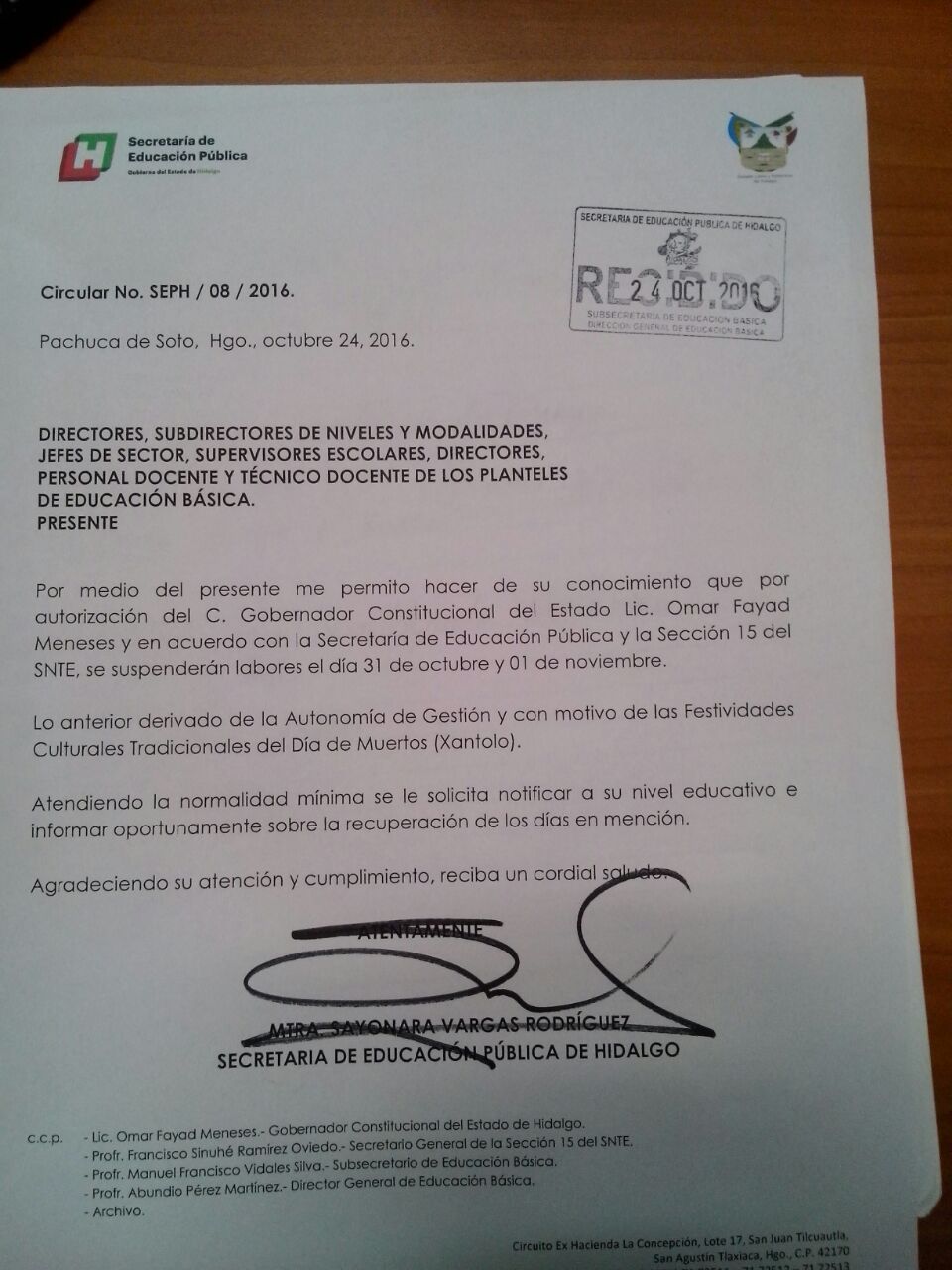• Lunes 31 y martes 01 suspensión autorizada por el gobernador de Hidalgo,  el titular de la SEP y del SNTE sección XV (derivado de la autonomía de gestión y las Festividades Culturales Tradicionales del día de Muertos XANTOLO)