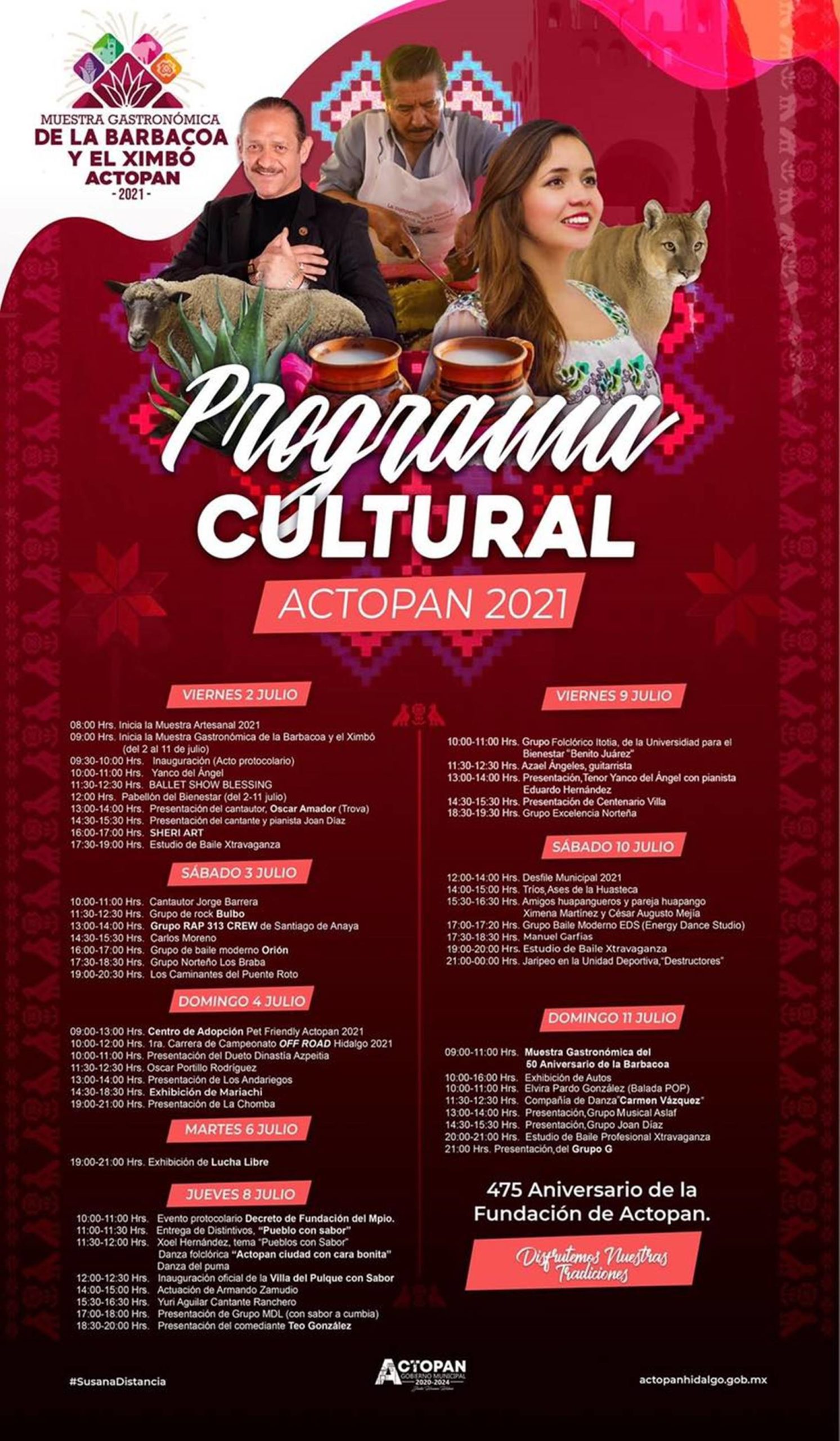 Luego de informarse la cancelación de la feria de Actopan, el ayuntamiento dio a conocer que este año se realizará la Muestra Gastronómica de la Barbacoa y el Ximbó con la aprobación de las autoridades sanitarias estatales; con motivo del 475 aniversario de la fundación de Actopan