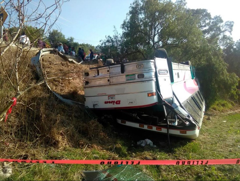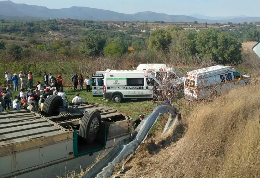 El accidente ocurrió a la altura del paraje conocido como la Curva de la Peña, donde el conductor de un camión marca DINA, color blanco con franjas color morado y rosa, placas 0611J1, perdió el control de la unidad, volcando a un costado del camino.