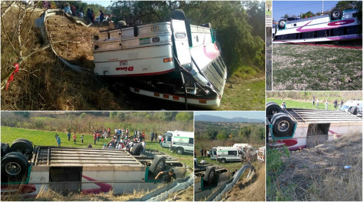 12 estudiantes de secundaria resultaron lesionados por la volcadura de un autobús de pasajeros que transitaba en la carretera estatal Texcatepec-Chilcuautla, confirmaron autoridades de seguridad pública estatales; el conductor del autobús se dio a la fuga.
