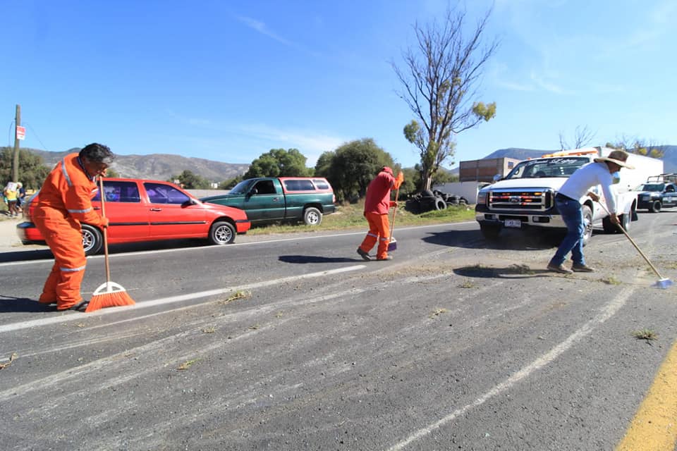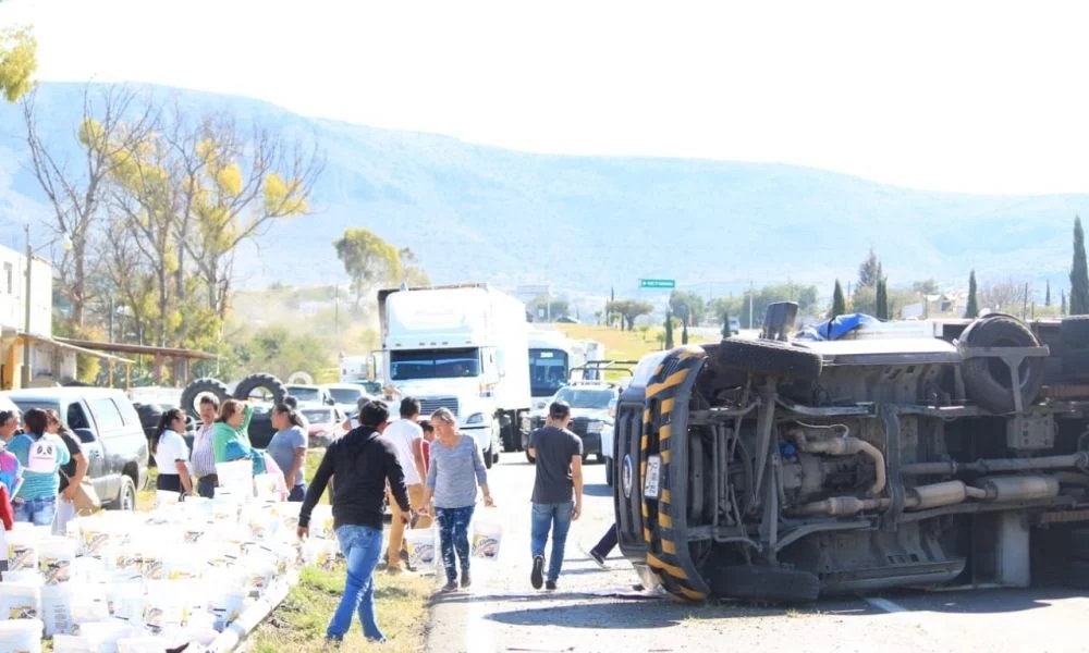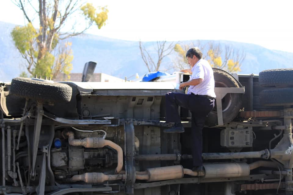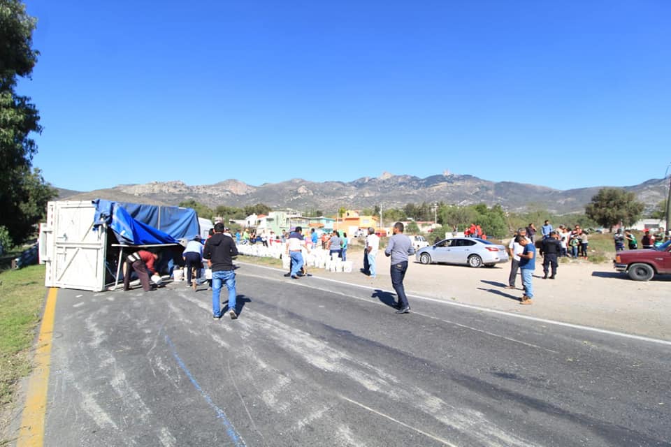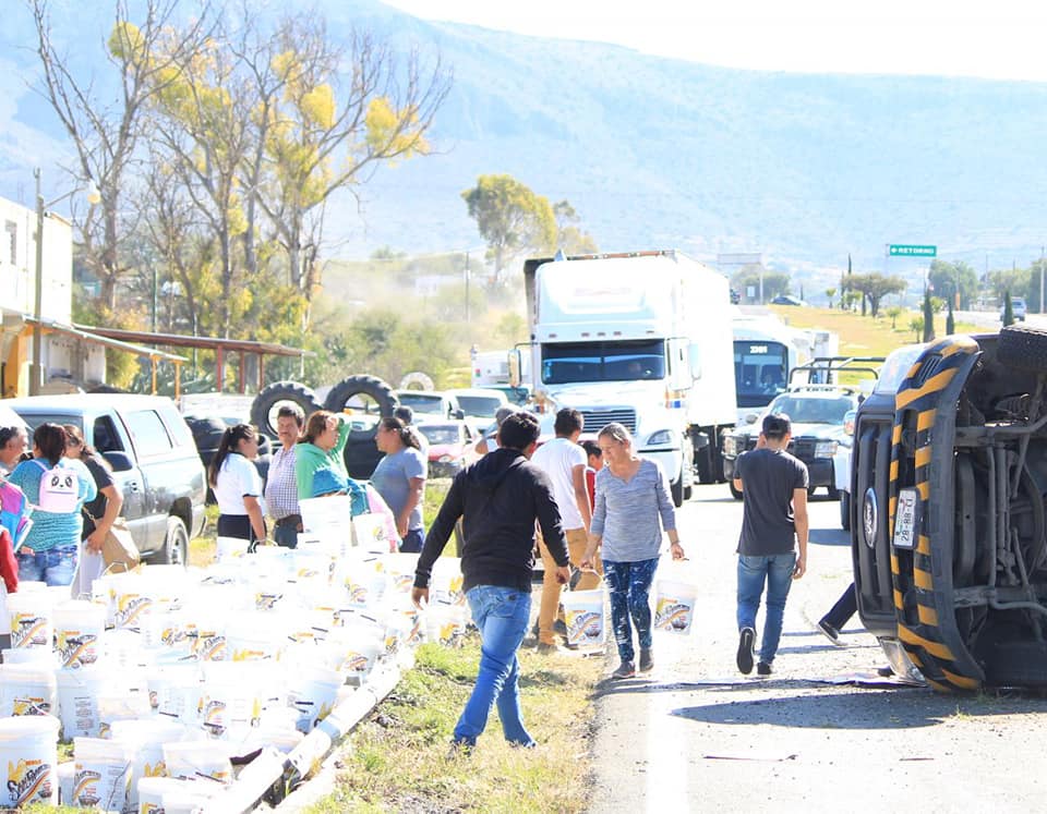 La tarde de este lunes se registró la volcadura de una camioneta de carga que transportabab cubetas de «mole», derrapó sobre la carpeta asfáltica en la carretera Pachuca – Actopan a la altura de San José Tepenene.
