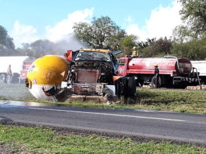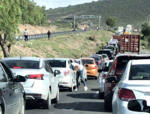 Como se puede ver en esta imagen compartida en redes sociales, la autopista quedó bloqueada por varios minutos debido a las acciones y maniobras de rescate de la pesada unidad.